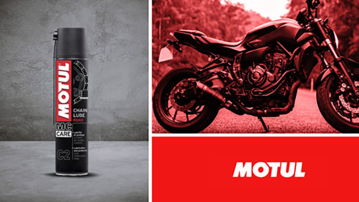 Motul consiglia MC CARE™ C2 CHAIN LUBE ROAD. Lubrificante spray per catene standard o con guarnizioni O-Ring, X-Ring, Z- Ring. La capacità di ridurre l’attrito e la perdita di potenza rende il prodotto adatto a moto da strada o go kart.