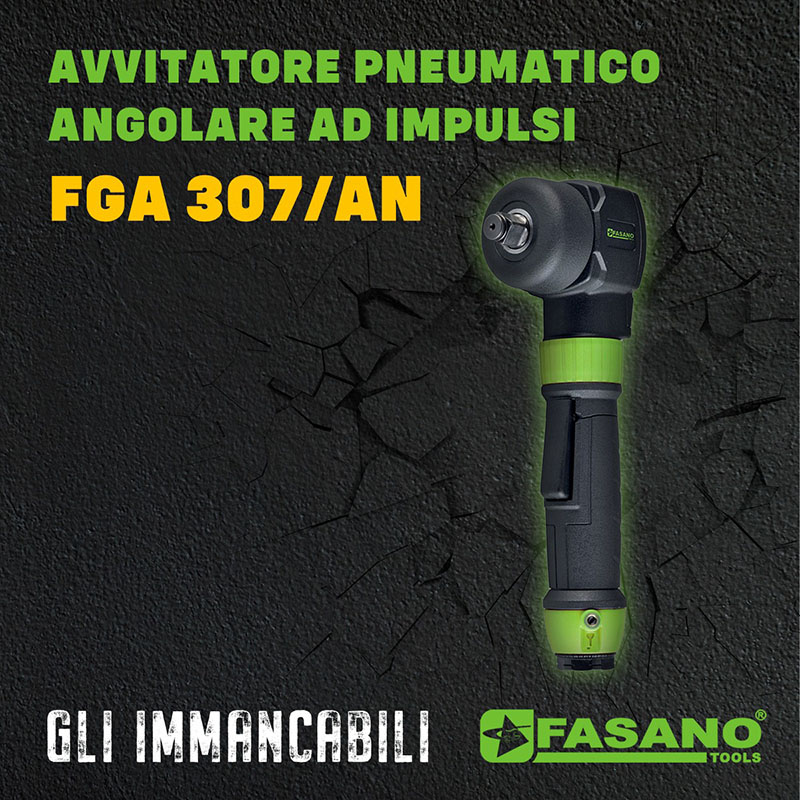 L’immancabile della settimana di Fasano Tools è FGA 307/AN, l’avvitatore pneumatico angolare ad impulsi con attacco quadro 1/2″. Maneggevole e potente, è dotato di meccanismo JUMBO HAMMER, sistema di reversibilità e regolazione doppio livello di velocità integrati, in un corpo ultra compatto: solo 88mm di profondità!