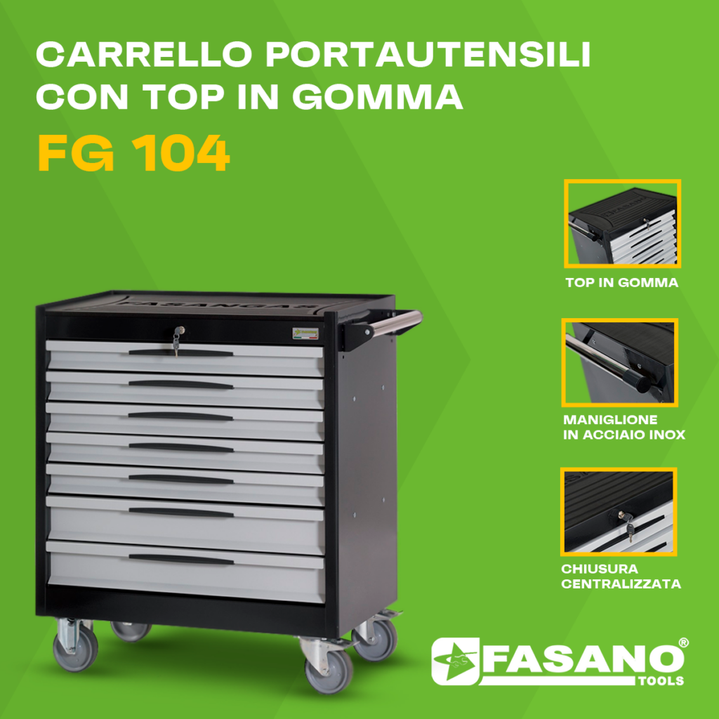 Robusto e stabile, il Carrello porta utensili FG 104 è l’ideale per mezzi pesanti. Le principali specifiche tecniche: – Guide telescopiche con sistema di aggancio automatico;- 4 ruote in gomma vulcanizzata;- Maniglione laterale in acciaio;- Cassetti con tappetino interno in gomma;- Top superiore in gomma espansa- Portata statica: 1.000Kg