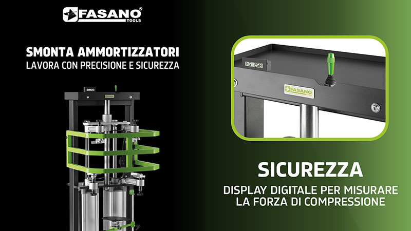 Fasano Tools e la sua gamma di Smonta Ammortizzatori. L’azienda leader degli utensili da lavoro mette a disposizione dei professionisti attrezzature che faranno lavorare in tempi brevi, con precisione e in totale sicurezza. Prodotti interamente realizzati in Italia. Gli Smonta Ammortizzatori di Fasano Tools sono dotati di un display digitale per misurare la forza di compressione, di uno speciale sistema autocentrante per posizionare i bracci rapidamente con una sola mano, basi d’appoggio con bloccaggio a volantino, e griffe in acciaio forgiato con incavo per una presa totale della molla senza rischi per l’utilizzatore.